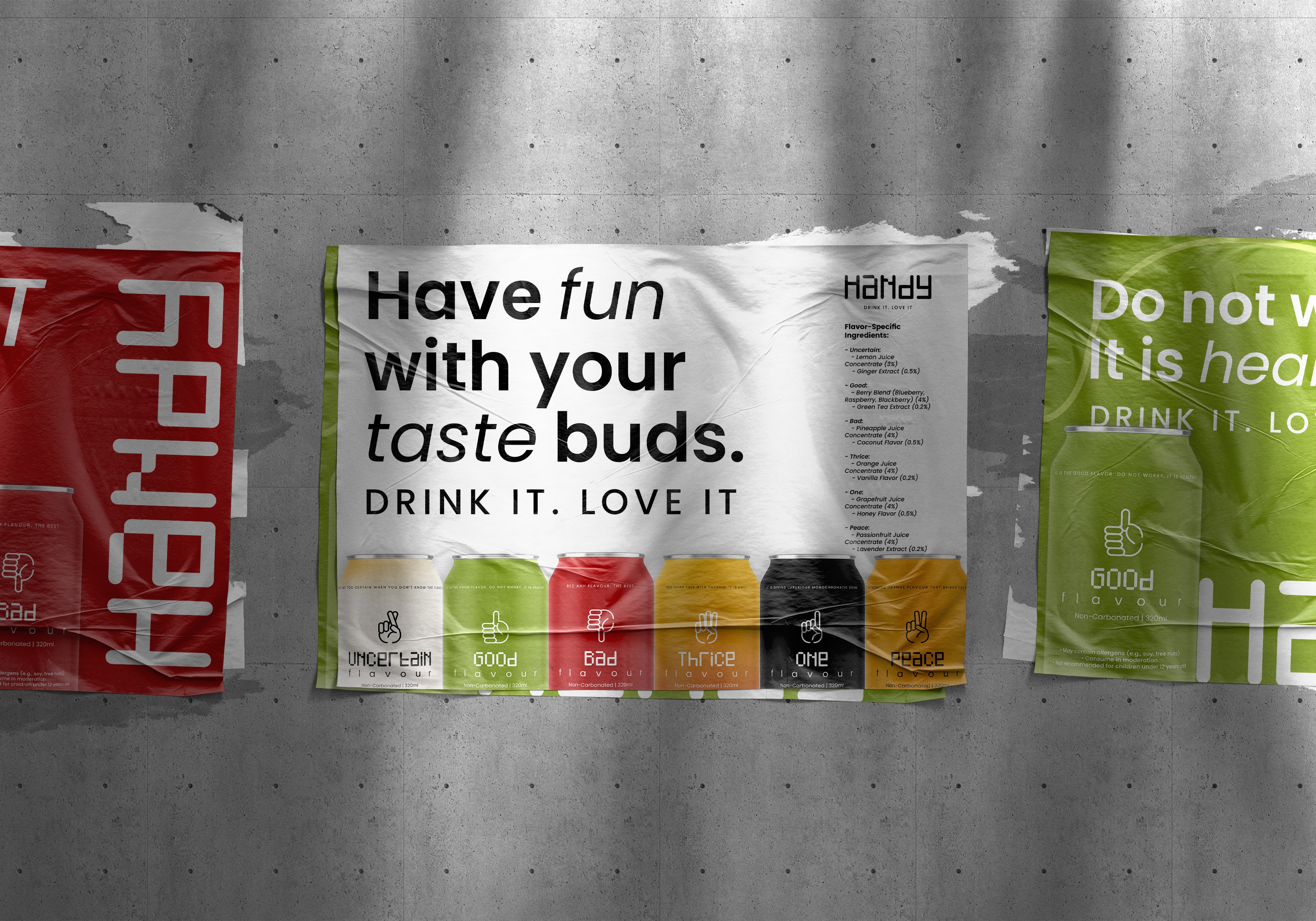 Handy is a non-carbonated, non-alcoholic soft drink brand that emphasizes the wellness of its consumers. In a market saturated with sugary, carbonated drinks, Handy stands out by offering a refreshing alternative that promotes health-conscious living without compromising on taste. This project involved developing a brand identity that highlights Handy’s commitment to wellness, clean ingredients, and a refreshing, guilt-free experience.